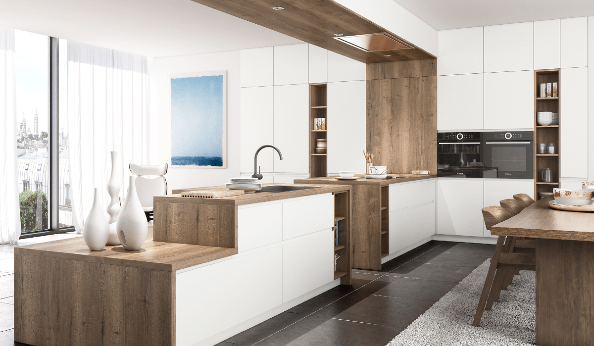 Amoureux du bois ? La cuisine CATHIA est faite pour vous. Aussi moderne qu'authentique, son mariage blanc craie mat et chêne Halifax tabac offrira du caractère, tout en modernisant la pièce.