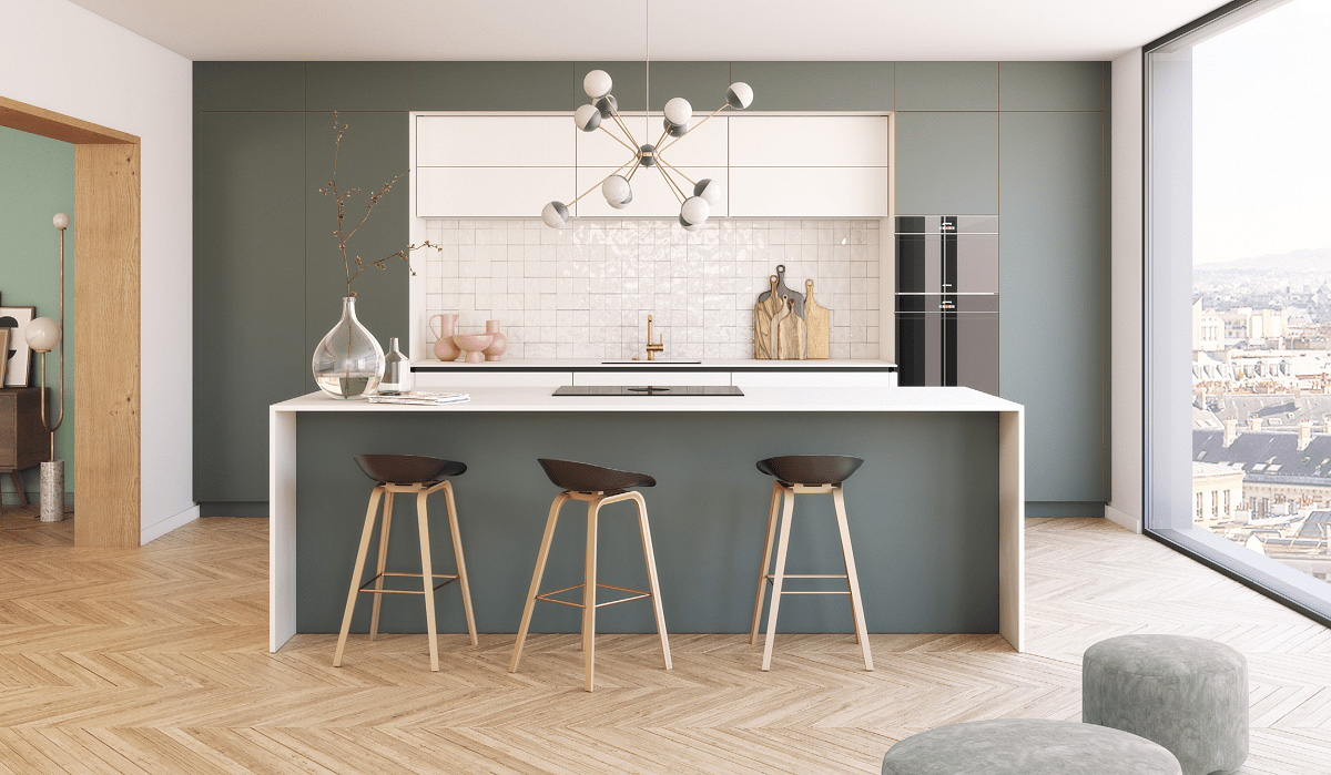 Libre à vous de disposer un peu de verdure sur l'îlot afin d'accentuer le côté nature de la cuisine, tout en rappelant le vert Comodoro des façades.