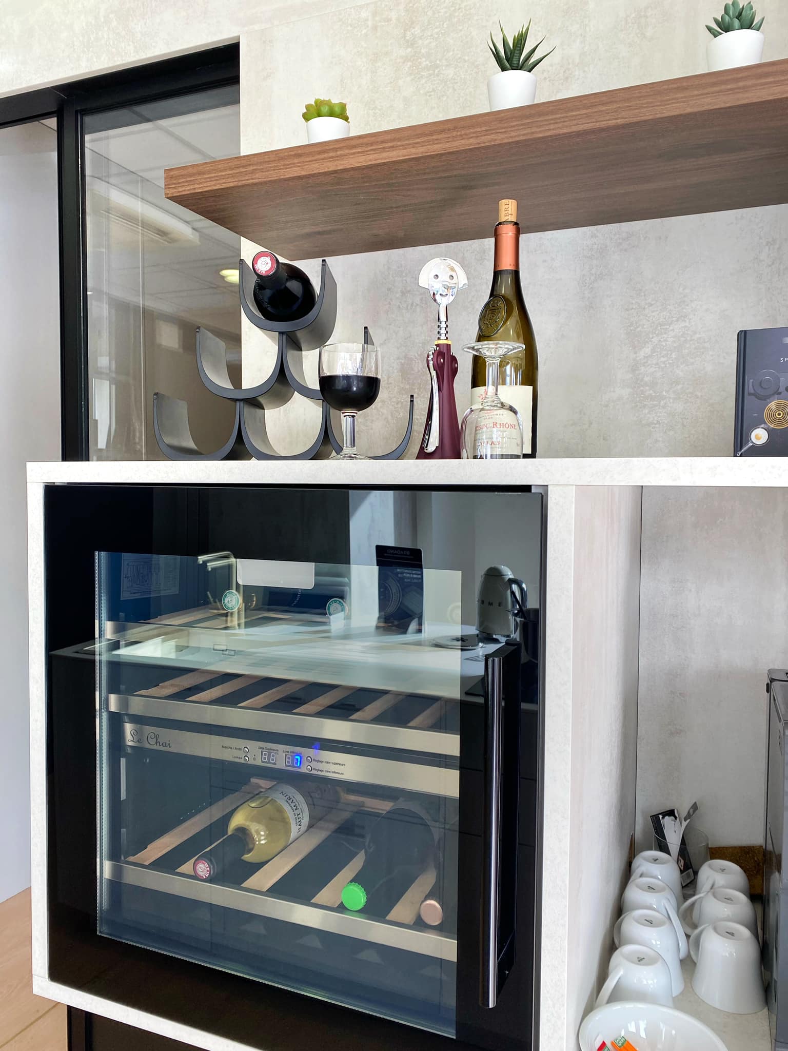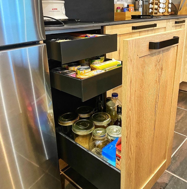 Petite cuisine, donc espace plutôt restreint. Résultat parfait. On a l’impression d’avoir tout ce qu’il faut où il faut. On a laissé Jean-Michel RASCLE organiser la cuisine et tout nous plaît. La qualité des produits et des équipement semble bonne.