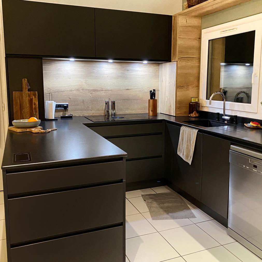 Ayant fait l'achat d'un appartement, j'ai voulu modifier la cuisine existante et surtout faire travailler le commerce de proximité. Ma pièce cuisine étant pas très grande, j'ai eu de très bons conseils et le résultat est très satisfaisant. Ma cuisine je l'ai choisie d'une couleur sobre et moderne. Le fait d'avoir choisi un plan de travail noir me le fera peut-être regretter mais on verra avec le temps. Ma cuisine et les équipements ont l'air de bonne qualité et surtout les cuisines sont fabriquées uniquement en France.