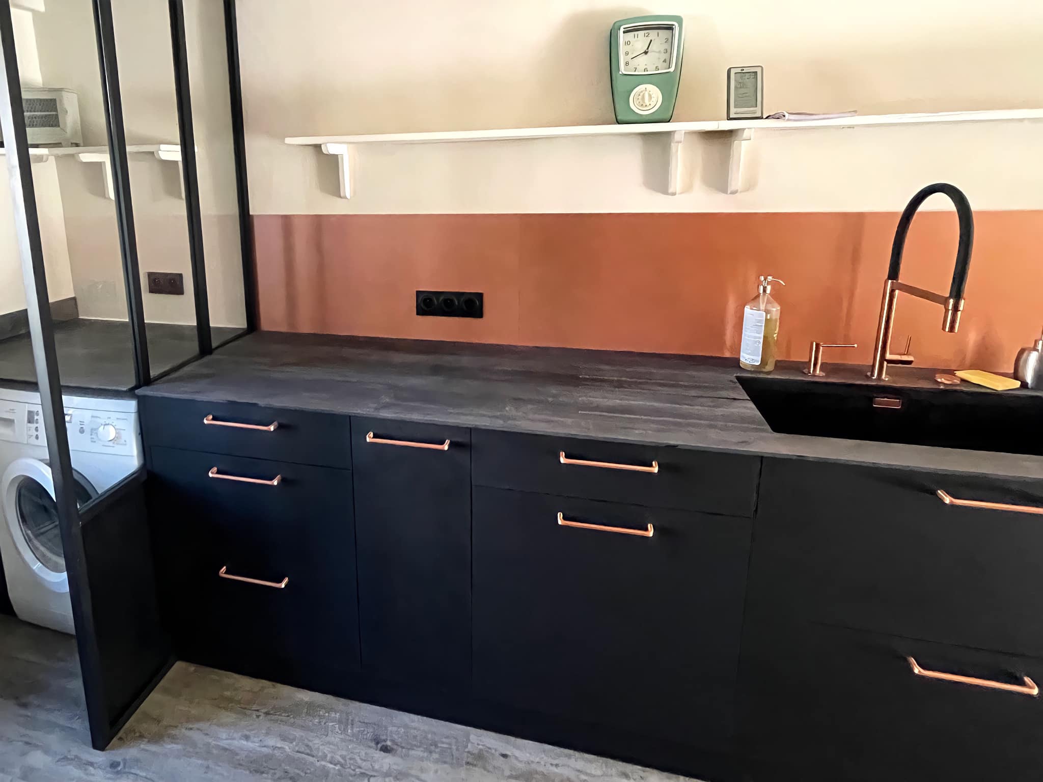 Aménagement d'une cuisine dans un immeuble locatif avec une contrainte de surface et un souhait de matériaux pratiques à l'entretien, résistants et esthétiques. Opération parfaitement réussie. A l'écoute, sérieux et bon service après vente et bon rapport qualité/prix.
